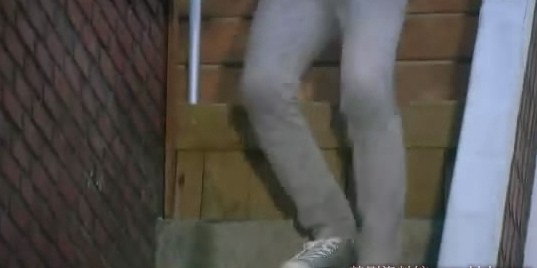 当他急匆匆跑到玄关处也是穿着拖鞋(见上图) 可是,不到几秒的时间,在门外楼梯处他已经换上了布鞋。(见下图)