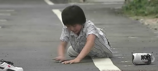 大家可以仔细观察00:14至00:16之间的镜头。前一个镜头孩子摔下去的时候鞋子掉在一起(已经落地了),接着鞋子突然分开了,分别掉在了俩地方,再在后来的几个镜头中鞋子的位置都是不同的(把下水道井盖作为参考物会很清楚的哈)详见上下图
