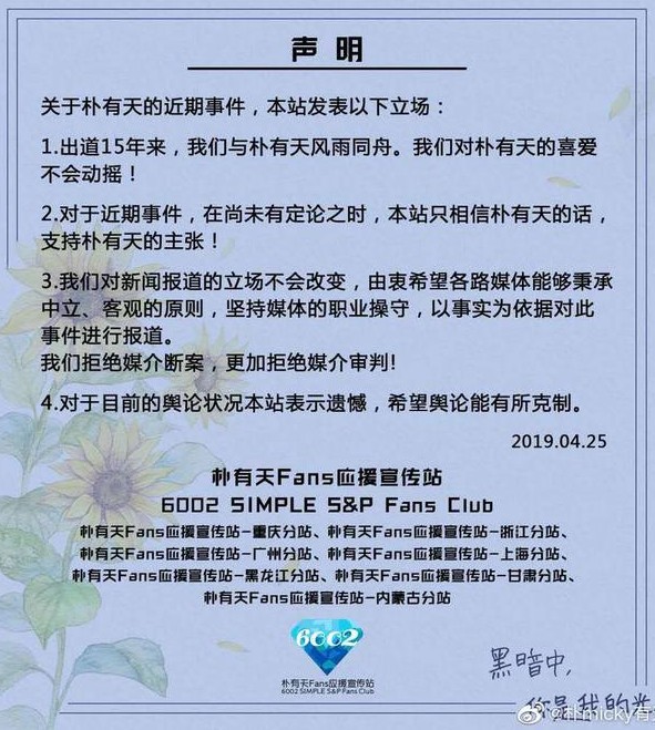 4月25日,朴有天中国粉丝在微博发表联合声明,称将全力支持严正声明的朴有天,会对朴有天先生永远不离不弃。