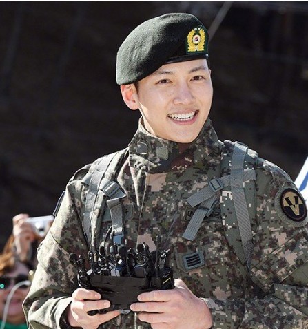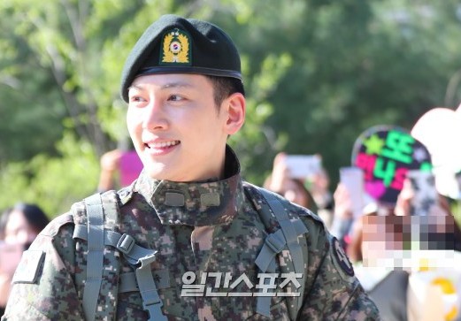 4月27日上午,韩国演员池昌旭在江原道铁原部队服完兵役退伍,结束服役生活。一身迷彩军装帅气现身,向民众敬礼谢意。