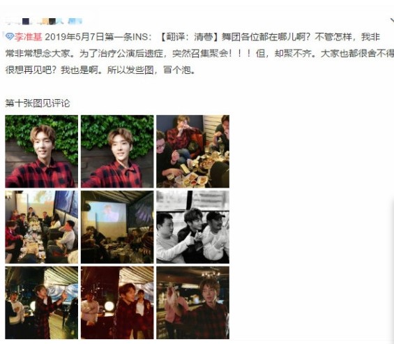 5月7日,李准基在社交平台更新了一组聚餐照,并配文:“舞团各位都在哪儿啊?不管怎样,我非常非常想念大家。为了治疗公演后遗症,突然召集聚会!!!但,却聚不齐。大家也都很舍不得很想再见吧?我也是啊。所以发些图,冒个泡。”照片中,李准基身穿黑红格子衬衫,青春又有活力,席间与好友推杯换盏,大聊特聊,玩得不亦乐乎。不过,随后就有眼尖的网友发现,聚会上竟然有一个女生与李准基穿着同款的情侣衫,也有网友指出,该女子是打架子鼓的鼓手,两人只是刚好撞衫。李准基也注意到了,并在动态里有说大家一起穿红色衬衫。