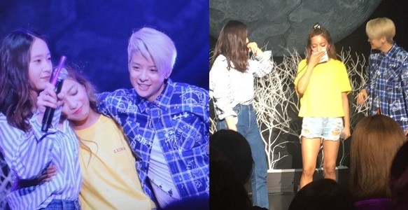 Luna这两天举办个人演唱会‘The fragrance of Luna’,而今(26日)晚间是第二天,当演唱到f(x)在三年前发行的主打歌《All Mine》时,两位成员Amber与Krystal无预警出现在舞台上,不只粉丝不知道,连Luna本人都超意外,当场掩面哭出来、中断演唱!