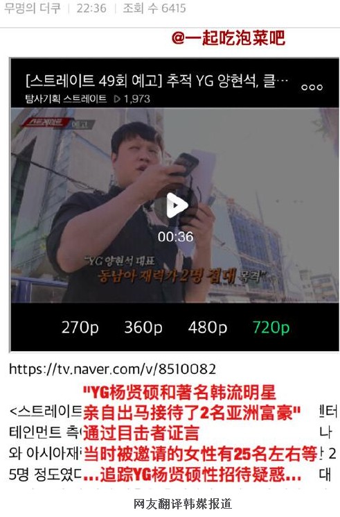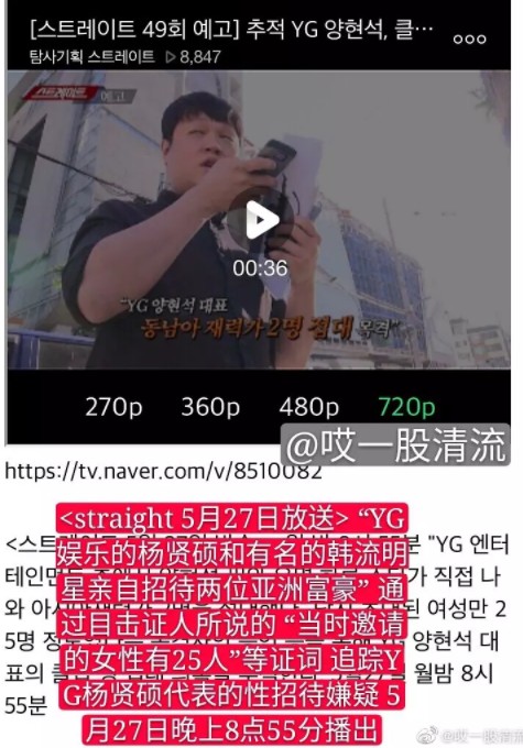据韩媒报道,日前,据电视节目straight 名为《追踪YG杨贤硕夜店性招待疑惑》的预告,胜利事件中,老板杨贤硕也涉嫌组织性招待,目击证人称当时杨贤硕与有名的韩流明星亲自招待了两名亚洲富豪,为此邀请了25位女性。5月27日晚节目将揭露杨贤硕和有名的韩流明星亲自招待亚洲富豪的新闻。
