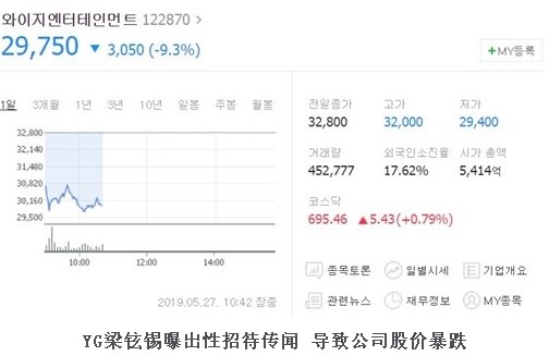 韩国YG娱乐公司的股价今天上午因公司代表梁铉锡曾性招待东南亚富豪的传闻而出现了暴跌。