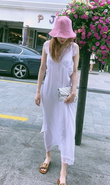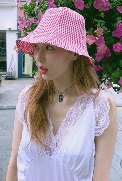 5月27日,泫雅晒图,身穿白色蕾丝裙,头戴粉色帽子,表情俏皮可爱。