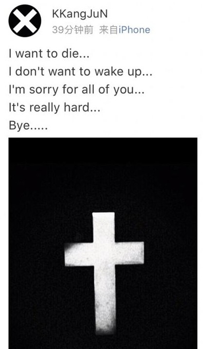 昨日深夜,曾与韩庚同是SM娱乐公司练习生的super Junior前预备队员姜俊英连续在微博留下英文“遗书”:“我想死,我不想醒来,对不起各位,我真的好痛苦,再见。”“我希望过得愉快,当我们再次相见的时候,谢谢你们,很抱歉,我爱你们,我想休息了。”不少网友纷纷@韩庚,希望可以帮助到他。