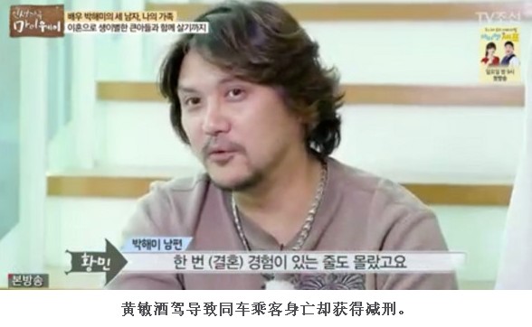 据台媒体报道,韩国音乐剧演员黄敏(황민)是知名实力派演员朴海美(박해미)的前夫,去年8月酒驾造成同车的4名音乐剧演员有2人过世、2人受伤,原本被判坐牢4年6个月,上诉后获得减刑引起大批韩民众不满。