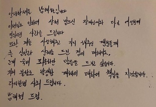 韩歌手南太铉近日在SNS发亲笔信,为自己出轨一事公开道歉。