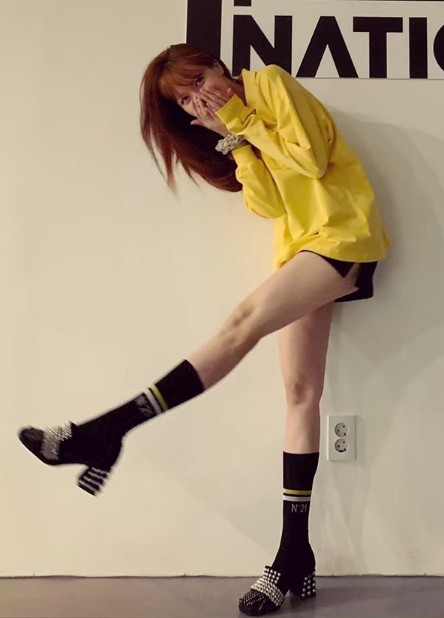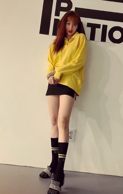6月14日,泫雅社交网晒出一组美照,照片中泫雅身穿黄色男友风上衣,下身搭配超短开叉裙,拉低镜头秀出白嫩筷子腿,蹲地对镜头托腮wink。