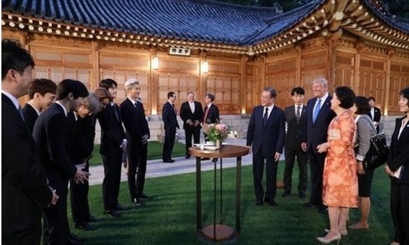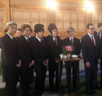 6月29日,韩国总统文在寅在青瓦台设宴招待特朗普一行人。韩国组合EXO也前往青瓦台出席此活动,向特朗普和伊万卡赠送签名专辑。