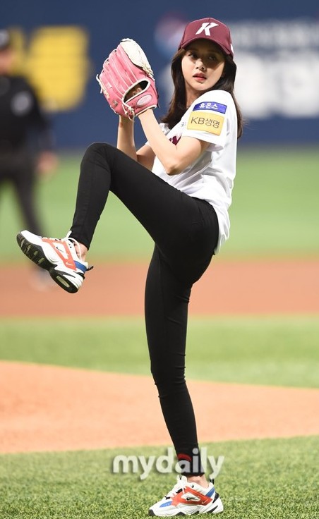 7月3日下午,韩国女艺人韩宝凛在首尔天空巨蛋运动场担任了职业棒球比赛的开球嘉宾