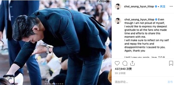7日,BIGBANG崔胜贤通过社交网站向粉丝表达了歉意和感谢,“虽然我无法堂堂正正的面对自己,但想对帮助我度过这一瞬间的粉丝们表示深深的感谢,以后将继续反省,会怀着因给粉丝带来伤痛和失望而抱歉的心情生活。”