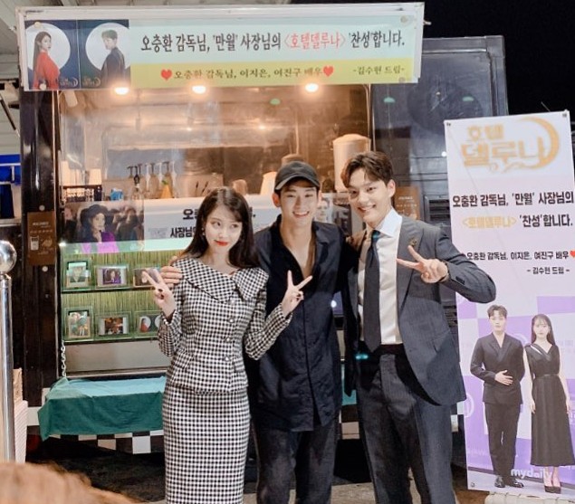 韩人气演员金秀贤来到韩剧《德鲁纳酒店》的拍摄现场,为好友IU和吕珍九加油。16日,IU在自己的SNS上传了一张与金秀贤、吕珍九的合照。附文“白承灿来参观酒店”的字样。吕珍九也发文表示:“很惊喜,非常感谢秀贤哥。收到能量后我会更加努力的。”并上传了三人合照。金秀贤曾与吕珍九合作韩剧《拥抱太阳的月亮》,与IU合作过韩剧《制作人》。