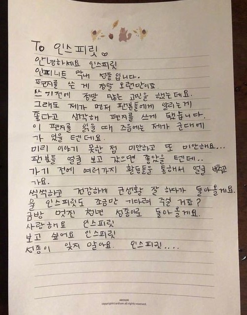 29日,韩男团infinite成员李成种发表手写信告诉了粉丝自己已经入伍的事情。成种22日入伍,在接受基础军事训练后,将作为社会服务要员进行服务。成种在歌手生活中因为腰部和颈部受伤,被判定为4级(社会服务)。以下为给粉丝的手写信全文: