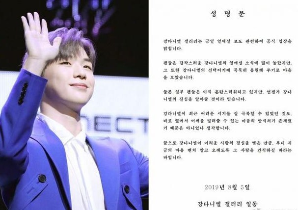 姜丹尼尔粉丝发声明表示“虽然粉丝们对姜丹尼尔突然传出的恋爱传闻感到非常惊讶,但是因为是姜丹尼尔的选择,我们决定默默地支持他。当然,一些粉丝现在会感到困惑,但我相信,总有一天她们会明白姜丹尼尔的真心。姜丹尼尔之所以能够很好地克服最近的困难时期,我想也是因为他身边存在着可以借给他肩膀的安身之所。最后,姜丹尼尔收获了艰难的爱情果实,希望不要改变心意,长久地珍藏这份爱。”