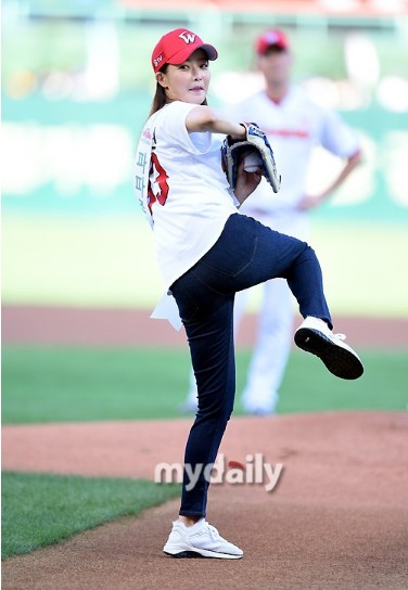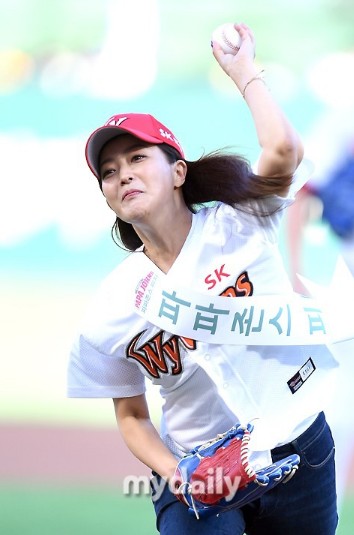 8月24日下午,韩国女艺人金喜善在仁川棒球场担任了职业棒球比赛的开球嘉宾。