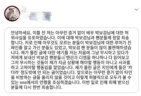 26日,该网友在社交网站上发文,承认造谣并向朴宝剑致歉。他承认“毫无证据的散布了演员朴宝剑的虚假消息”,在“一一阅读朴宝剑的粉丝的留言后,知道自己应该道歉和改正”,并“保证以后不会再没有证据发表诽谤他人的文章了”。