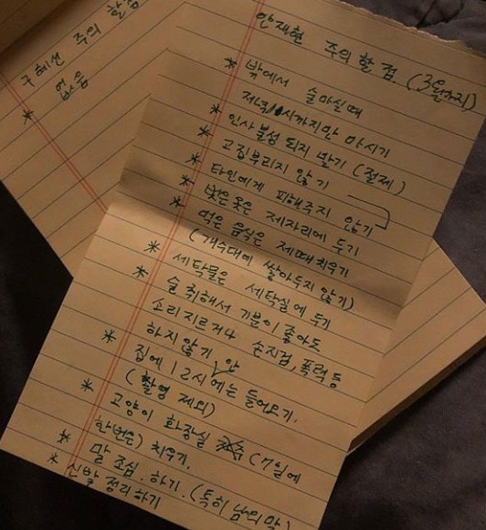 便条上写着“安宰贤注意点”、“具惠善注意点”。“具惠善注意点”上写着“没有”,“安宰贤注意点”是“在外面喝酒只喝到晚上11点”,“不要不省人事”,“不要固执”上面写着“不能给他人带来损害”、“脱下来的衣服要放回原处”、“吃剩的东西自己收拾”、“即使喝醉了心情很好,也不要大喊大叫或殴打、暴力等”、“12点回家(除拍摄外)”、“说话要小心”等。