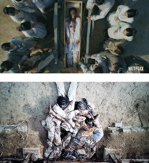 以朝鲜王国为背景,加上韩剧观众更为熟悉的宫斗背景,给《王国》中的丧尸故事,添加了东方神秘色彩,无论是被铁链锁在深宫,早就成为了丧尸的国王,还是王宫后花园的莲花池中,数以百计被啃食而死的悬浮在池水中的宫女尸体,或者是老年贵妇不听劝告,硬要带已经变为丧尸的儿子上船,让整条原先为求生而渡海的船,成为一条幽灵鬼船的情节,甚至精细如片头的设计都符合这种神秘东方氛围。