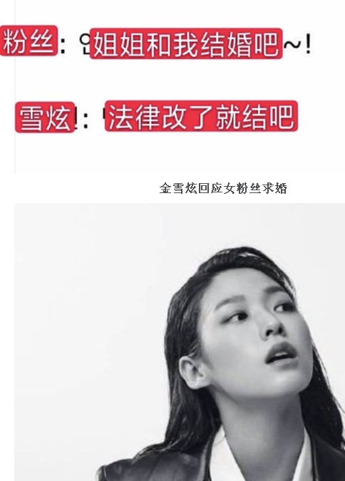 近日,有韩网友晒出了金雪炫与粉丝的对话。该网友透露,粉丝对金雪炫称“姐姐和我结婚吧!”获金雪炫回复道:“改了法律就结吧。”该对话一出,引起网友们的纷纷热议,不少表示:“姐姐太slay”、“马上去青瓦台请愿”。
