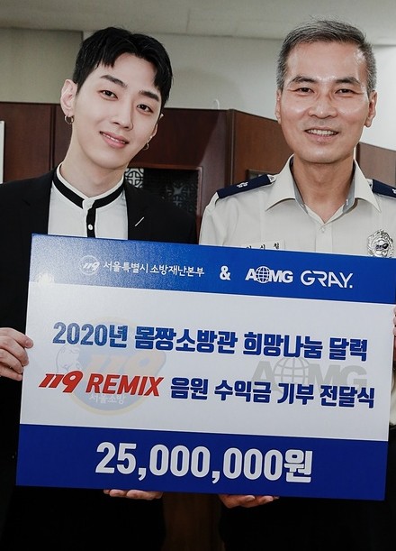 17日,据媒体报道GRAY最近代表朴宰范、Simon Dominic等所有参加《119 REMIX》的艺人,参加了在首尔中区首尔消防灾难本部举行的捐款仪式。将去年12月发行后成为热议话题的《119 REMIX》的音源收益金2500万韩元(约人民币15万元)全部转交。AOMG相关人士表示:“以此次捐款为契机,我们正与首尔消防灾难本部合作准备宣传引起社会对消防员和烧伤患者关注的内容”。