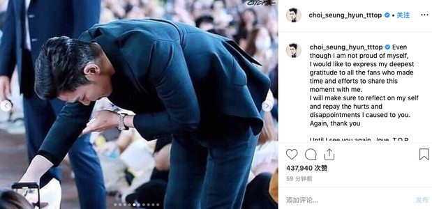 BigBang成员T.O.P的ins评论区有韩国网友留言:“你专心反省啦,不要再用ins,也不要再惦记着复出”。T.O.P回复:“好的呀上帝,我也没有这个打算。”