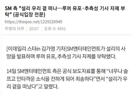 SM娱乐公司表示,崔雪莉的家人因突如其来的噩耗而沉浸在巨大的悲伤中,希望人们能够考虑他们的心情,不要再转发没有根据的谣言和猜测性报道。最后,SM娱乐公司对崔雪莉的去世再次表示了深深的哀悼。