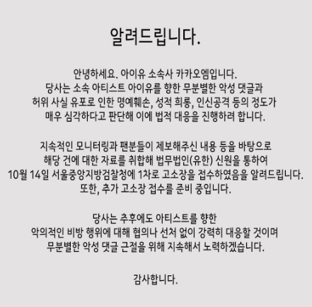 10月20日,韩国女艺人IU经纪公司发声明称“针对所属艺人IU的无差别恶性评论、虚伪事实传播导致的名誉毁损、性骚扰、人身攻击程度恶劣,并将进行法律应对。”